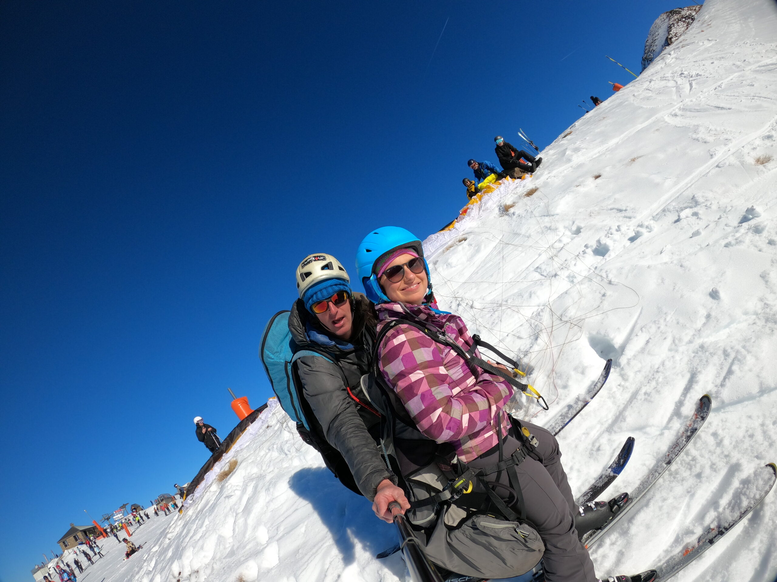 Pour le décollage depuis Peyragudes : en tant que passager, vous aurez juste à rester debout sur vos skis et à vous laisser glisser dans la pente, dès que la vitesse sera suffisante, nous nous envolerons, instant magique…